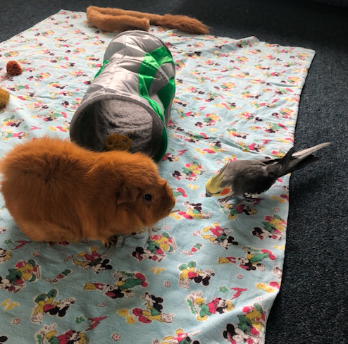 Yesterday I walked up town and got a bag of hay. Timmy hasn’t had hay in nearly two years because Bucky was allergic to hay. Timmy was so happy he was doing the guinea pig hop. 🙂 Big bird quite likes hay too. Patrick just likes to know what everyone is doing.