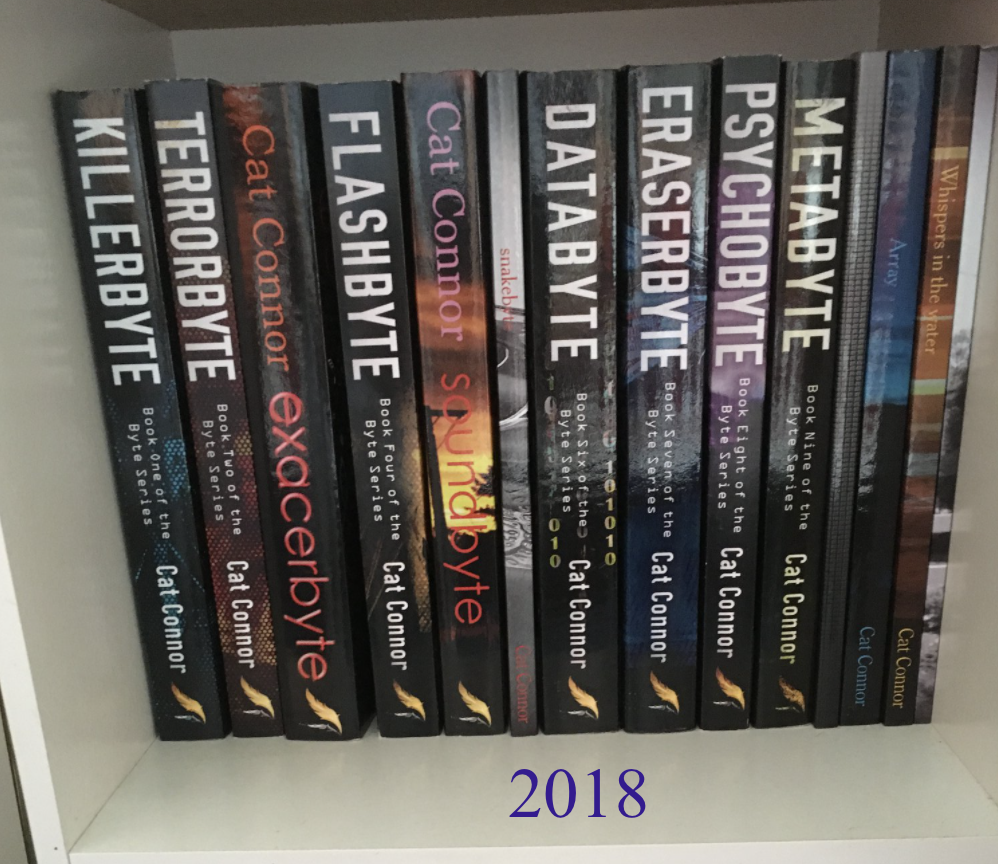 I never said I’d write a book. I wrote a book, then another, then another and so on. The 2022 shelf has original copies of some titles as well as the re-released versions. I guess I’ll find a new place for the originals to live. 🙂 EDITED because I forgot about Raidbyte, it was in a different bookcase!